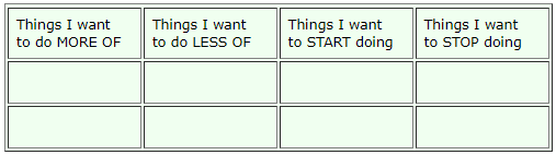 - Stop doing. Peter F. Drucker, the well-known management authority said, “If you want something new, you have to stop doing something old.” Sometimes stopping is more important, and more difficult, than beginning or continuing. One quote I like said, “It’s easier to get in than to get out.” I’ve found that to be true in my own life. Some of the most painful times have involved getting out.Make a 4-column chart like the one below and see what it reveals: